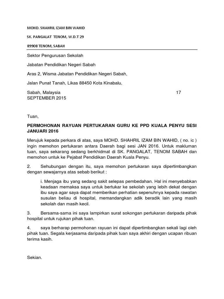 Surat Sokongan Permohonan Pertukaran Tempat Kerja / Contoh Surat Pertukaran Tempat Kerja Be Such A Good Blook Photogallery. Surat pekeliling perkhidmatan ini tidak terpakai untuk permohonan pertukaran dalaman agensi. Memperagakan nombor pendaftaran pelesenan kenderaan motor 15. Melibatkan urusan permohonan pertukaran antara agensi yang melibatkan keurusetiaan pertukaran di bahagian perkhidmatan, jpa bagi pegawai pegawai perkhidmatan gunasama persekutuan.